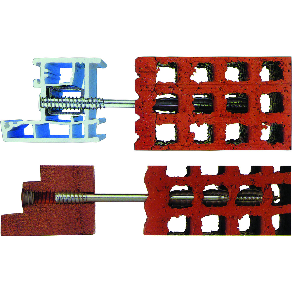 • veľmi dlhé hmoždinky - pre všetky duté komorové materiály, ako sú priečne dierované tehly, vápennopieskové dierované tehly, pórobetón a iné druhy muriva s vynikajúcou spoľahlivosťou hmoždinkových spojov