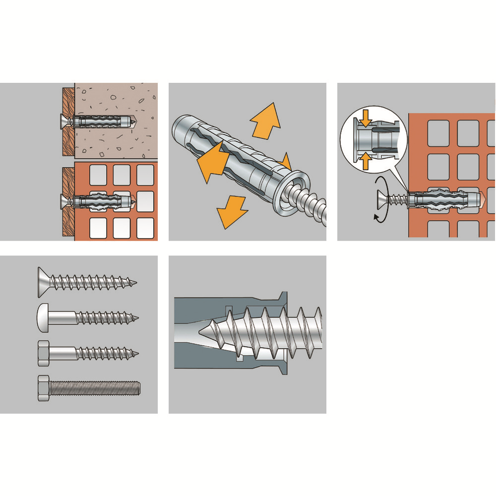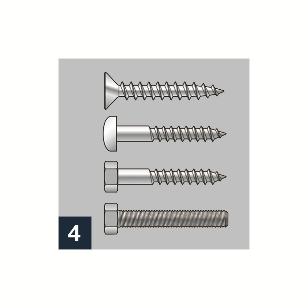 • možno použiť so všetkými dostupnými typmi vrutov a skrutiek, ako sú bežné vruty do dreva, vruty do drevotrieskových dosiek, vruty do plechu a vruty s metrickým závitom (obrázok 4)