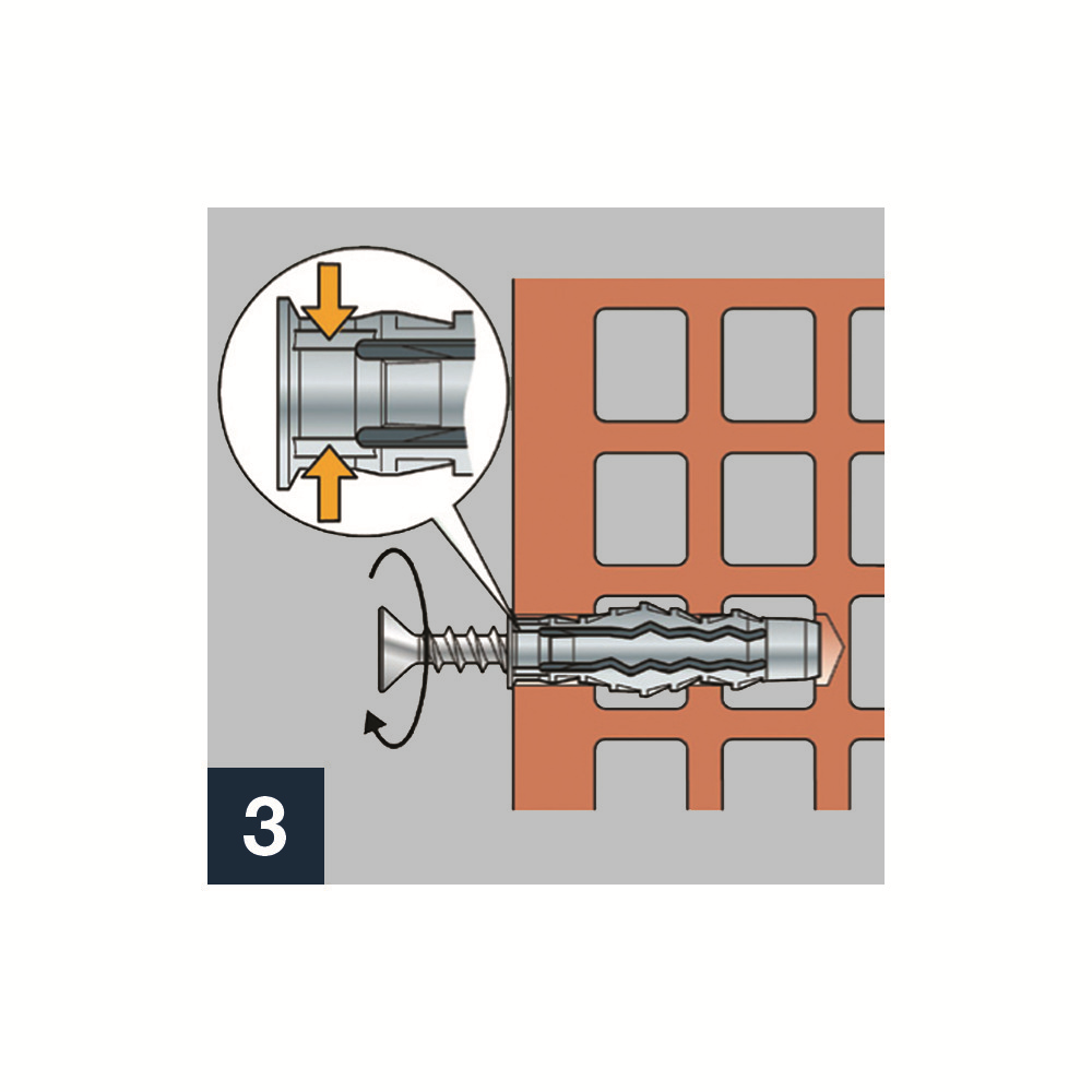 • pružný golier hmoždinky zabraňuje jej zapadnutiu do hlbokých otvorov, ale v prípade potreby umožňuje zarazenie vrutu (montáž prestrčením – obrázok 3)