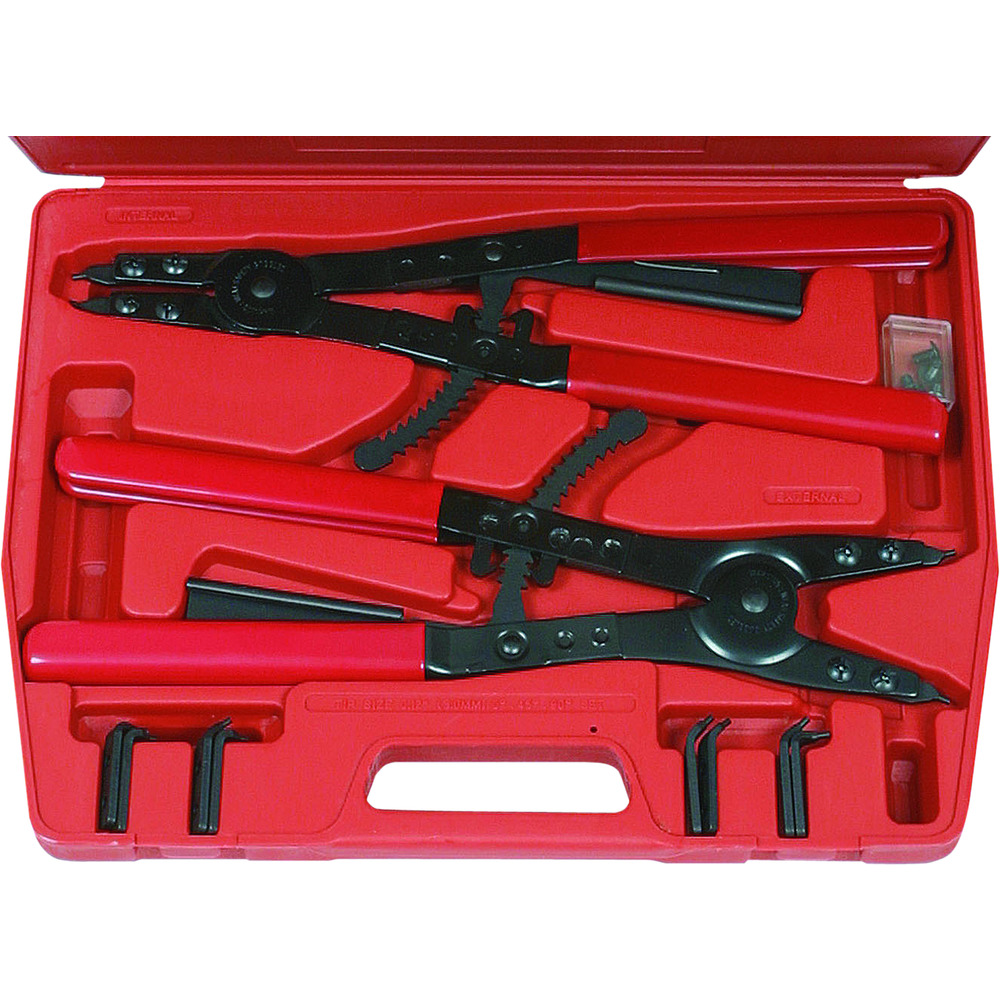 • pomocí této sady kleští můžete pouhou výměnou hrotů smontovat 6 různých kleští na Seegerovy pojistné kroužky