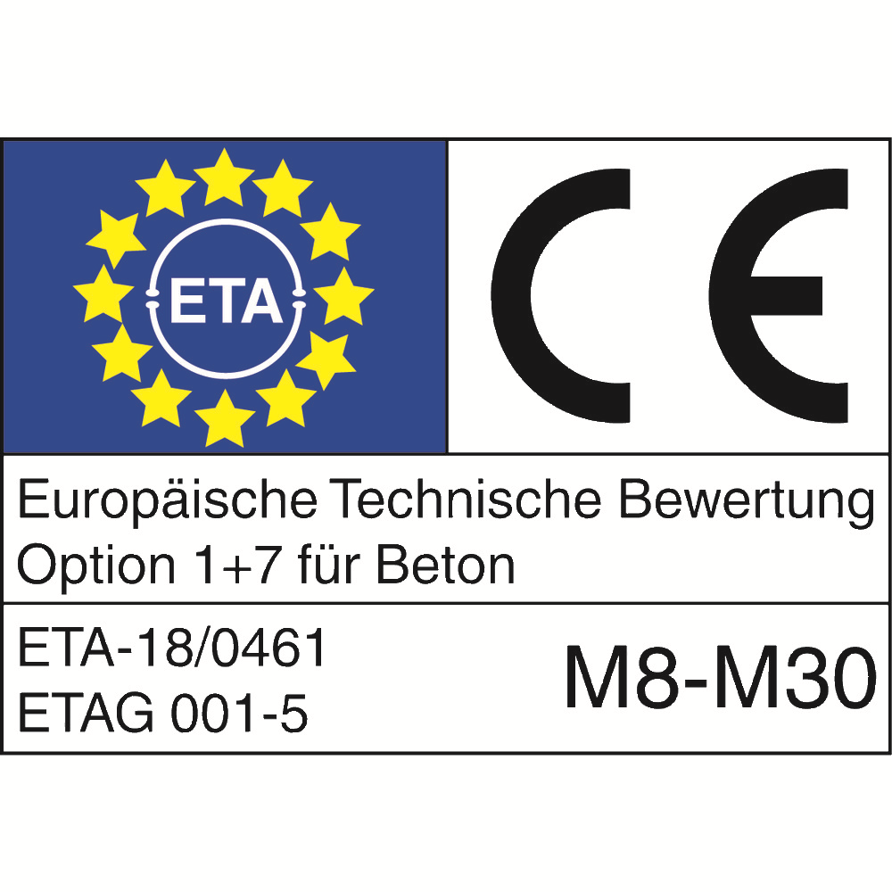 • schválenie ETA 18/0461 smernica 1, EAD 330499-00-0601 pre betón s trhlinami a bez trhlín v kombinácii s kotviacimi tyčami/závitovými tyčami vo veľkostiach M8 až M30