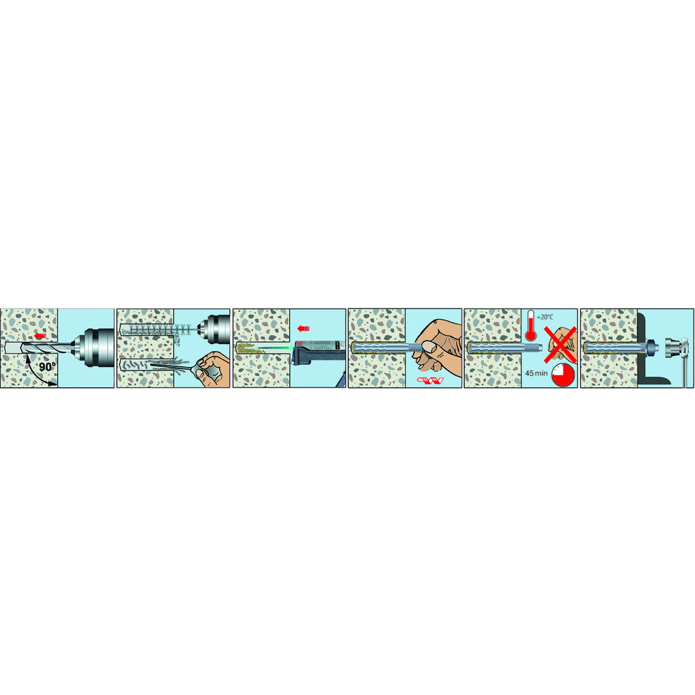 • vhodná na suchý a mokrý betón. Hmoždinky od veľkosti M12 sa môžu používať aj vo vyvŕtaných otvoroch naplnených vodou.