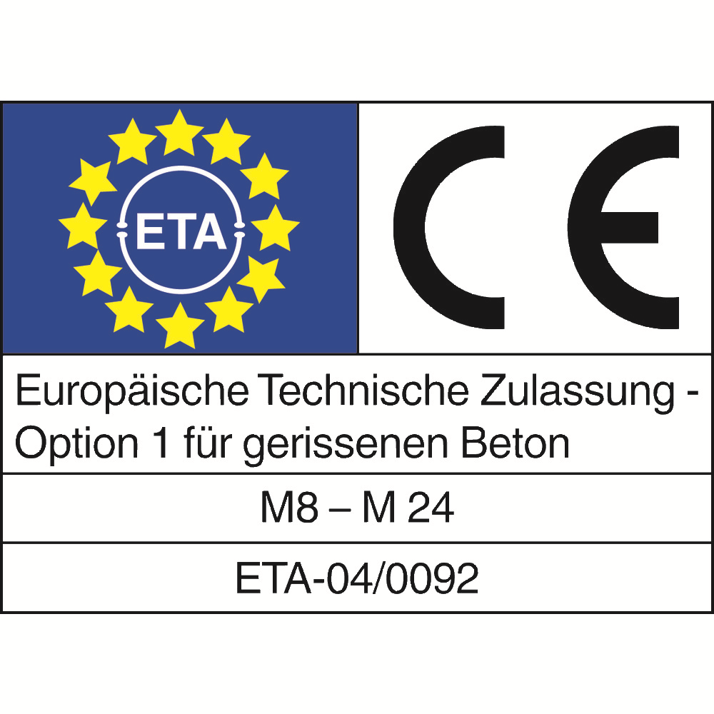 • schválená v spojení so závitovou kotevnou tyčou VMZ z galvanicky pozinkovanej ocele alebo so závitovou kotevnou tyčou VMZ z nerezovej ocele (A4) vo veľkostiach M8-M24