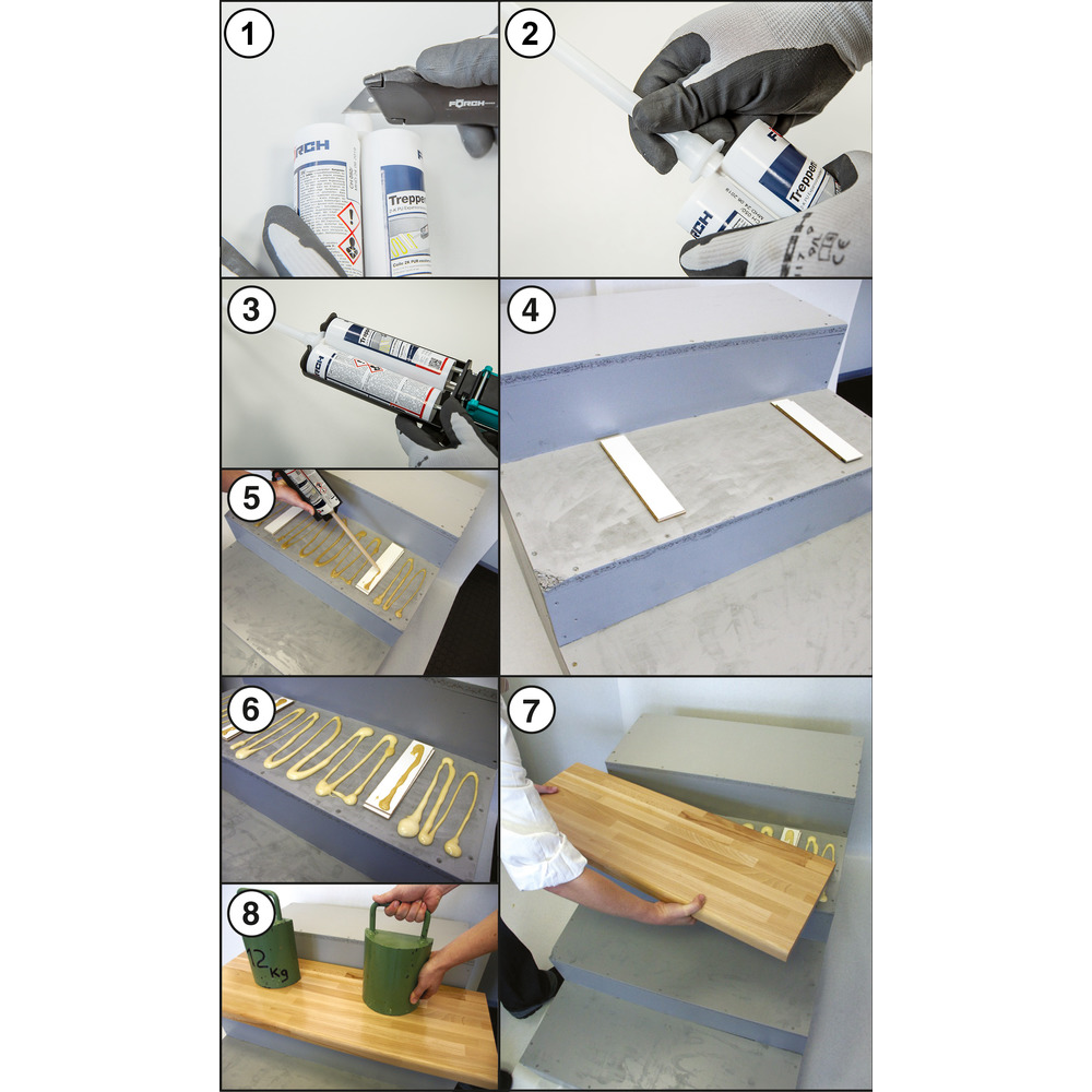 • Kontaktní plochy musí být čisté, suché, zbavené prachu a tuku. U sádry a pórobetonu je třeba nejprve provést základní nátěr odpovídajícím primerem. U schodů s podlahovou krytinou z PVC nebo s linoleem je nutné odstranit vosky, oleje apod. a vyčištěnou krytinu poté zbrousit. U lakovaných schodů se zbroušením vytvoří stabilní kontaktní plocha pro spojení.