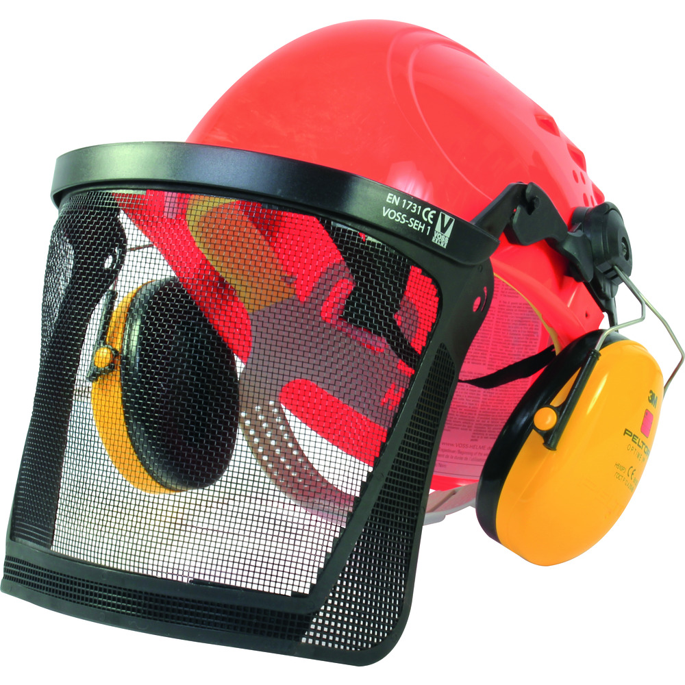 • s ventilací, silně prohnutý týlní pásek pro dokonalé usazení, držák řemenu pro bradu, nastavení velikosti v rozsahu 51-64 cm, včetně přimontovaných chráničů sluchu Peltor Optime I H510P3, SNR: 26 dB, namontovaná drátěná mřížka V4AK, použitelnost: nízká teplota do -20°C, umělé stárnutí (doba použití až 5 let)