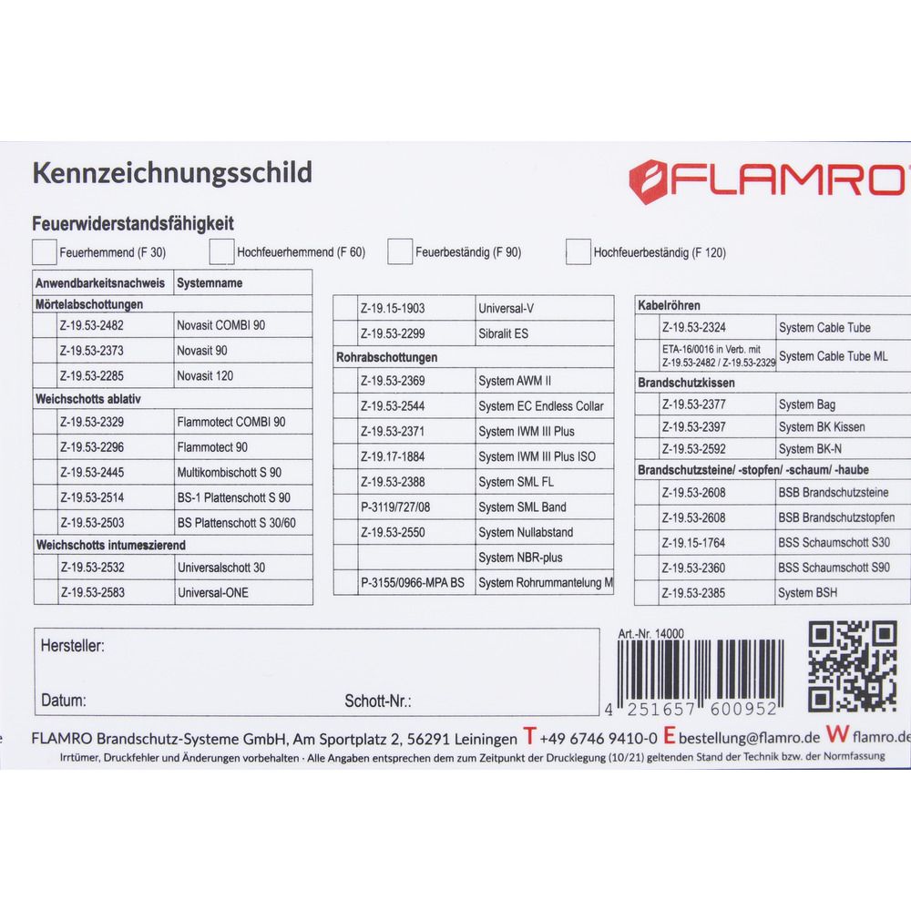Označovací štítok pre káblové, rúrkové a kombinované protipožiarne upchávky