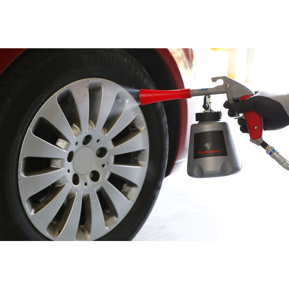 • hadice s médiem rotující ve vypouštěcím trychtýři vytváří efekt tornáda k odstranění částic nečistot z povrchu