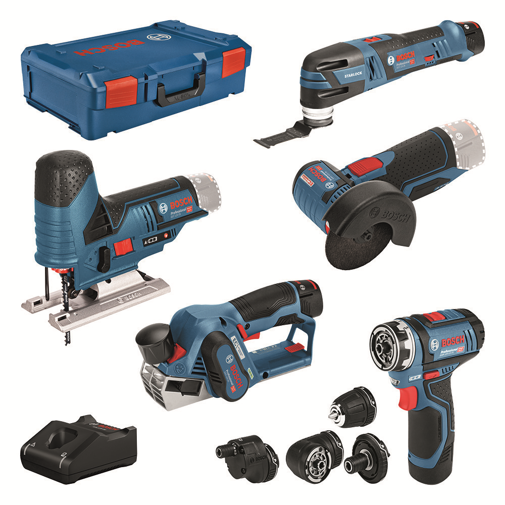 • Kombinovaná 5dílná 12V sada nářadí: GSR (FC) + GOP + GHO + GWS + GST + GBA (2 x 2,0Ah + 1 x 3,0Ah) + GAL + XL-BOXX