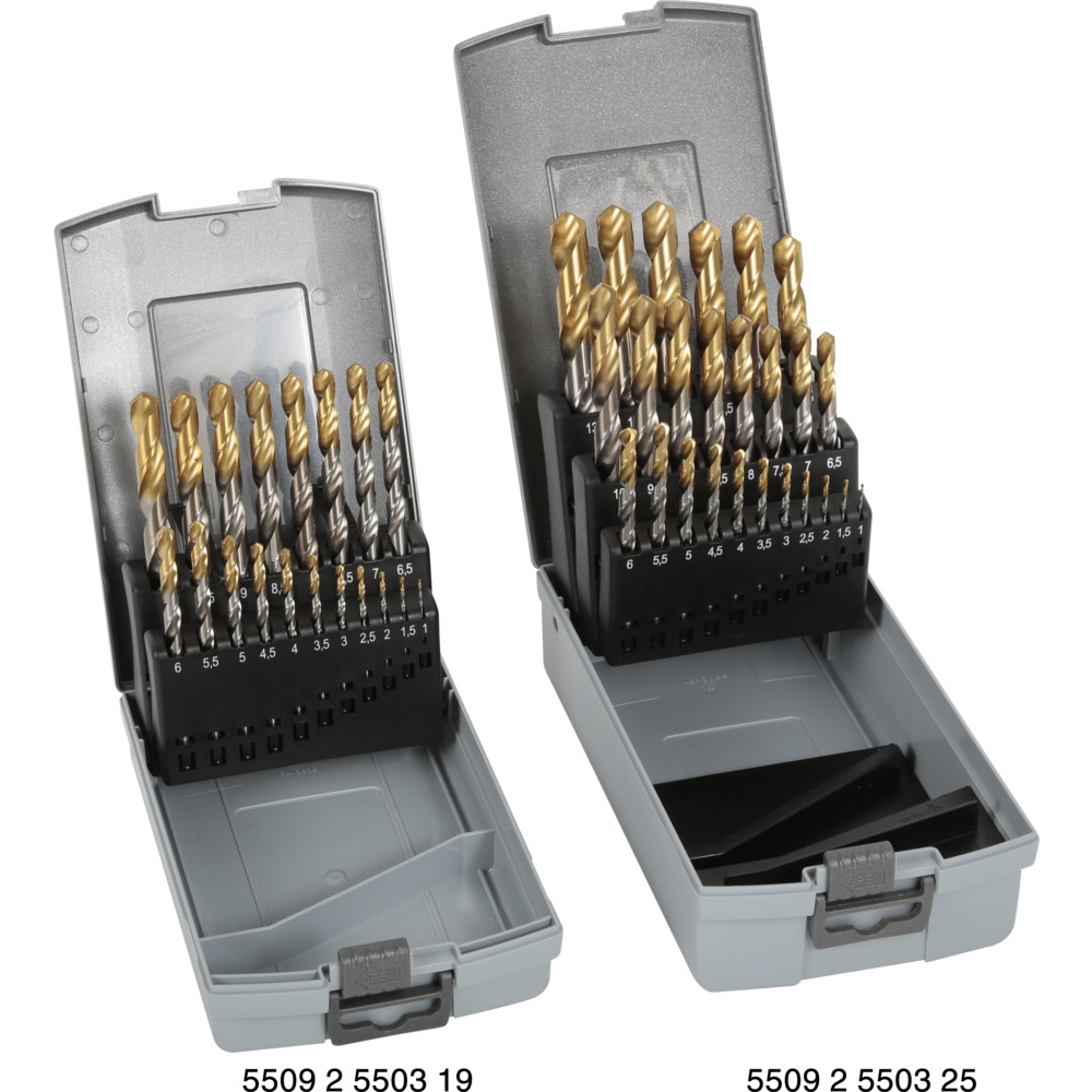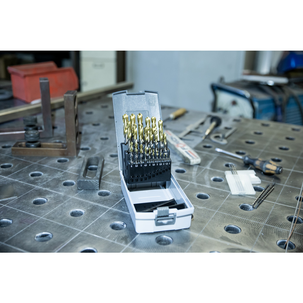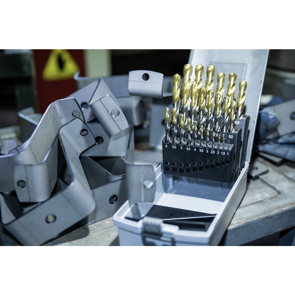 • vždy po 1 kuse - spirálový vrták DIN 338 HSS-TiN, povlakovaná hlava, vybrušovaný, typ N, Ø 1,0 – 13,0 mm (vrtáky jsou odstupňované po 0,5 mm)