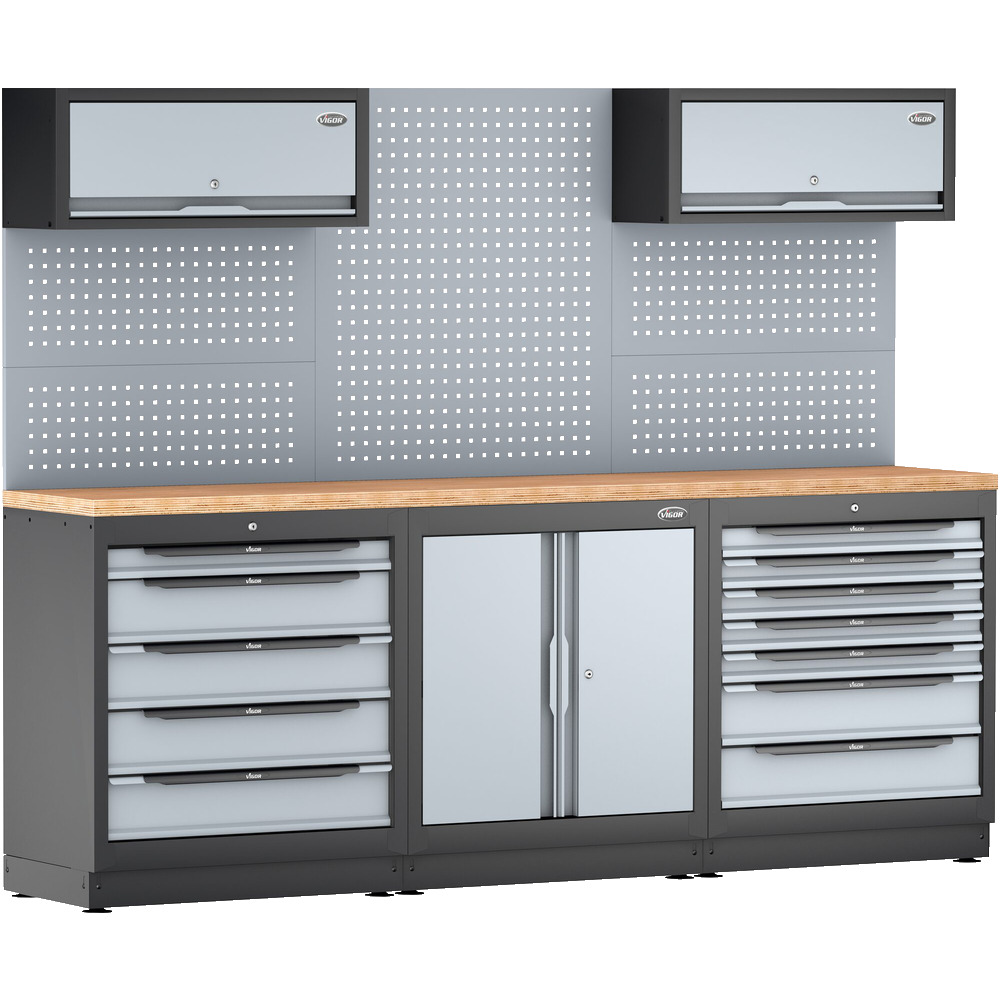 • 3modulová kombinace v širokém provedení, s děrovanou stěnou a závěsnými skříňkami
