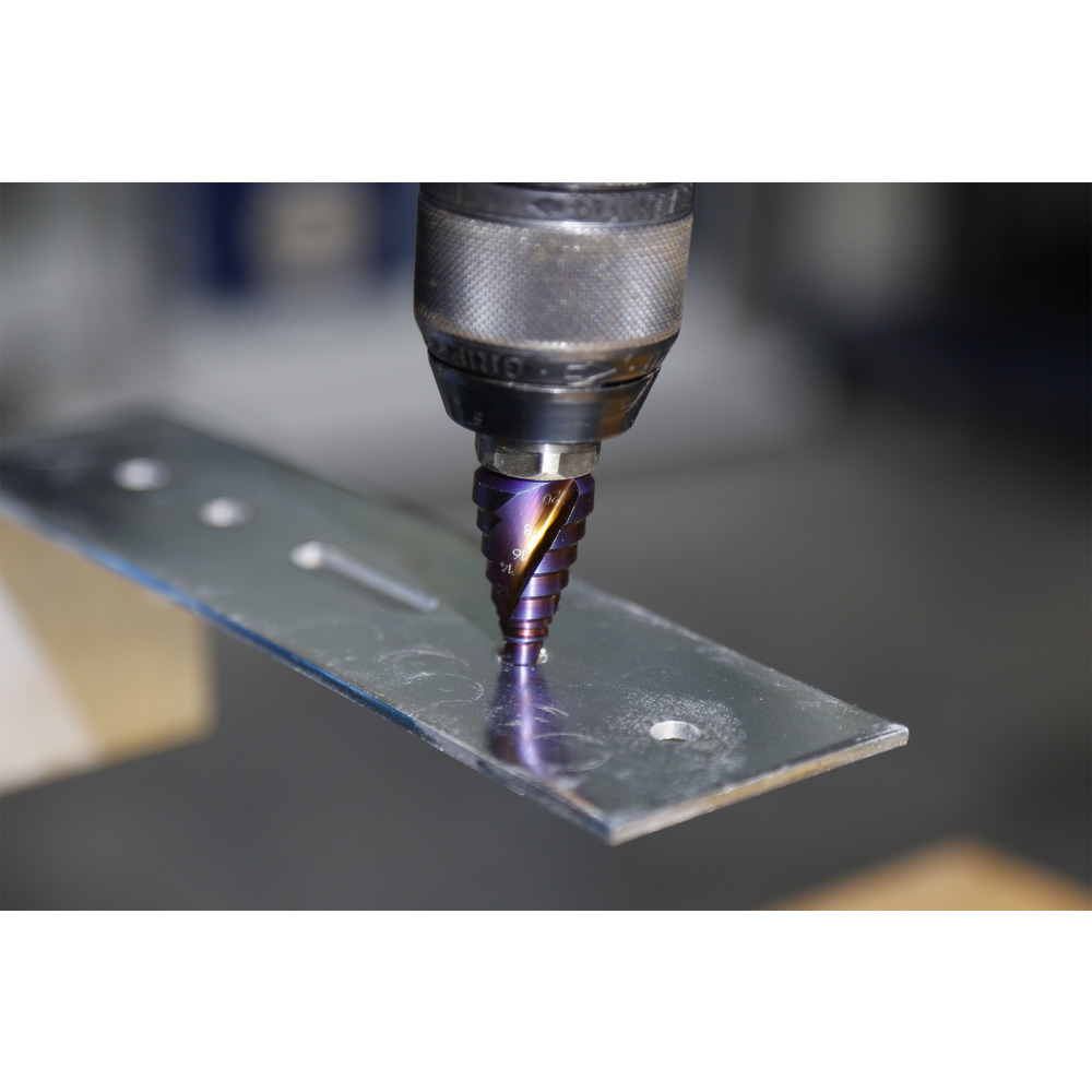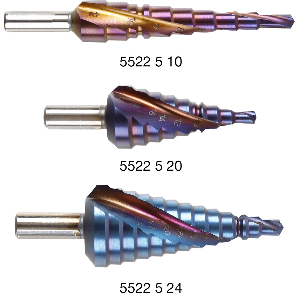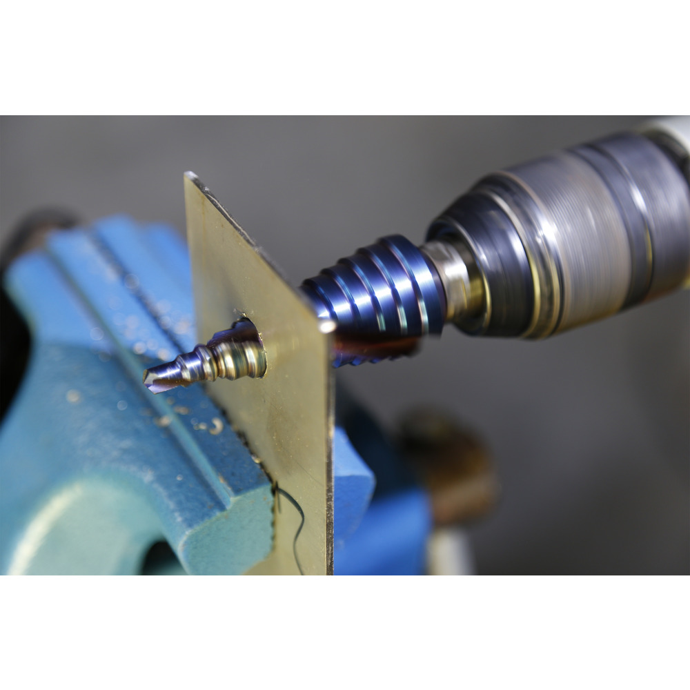 • stupňovitý vrták se srážečem hran - pro přesné vrtání a vystružení plechů a profilů bez ostřin - do tloušťky materiálu max. 6 mm