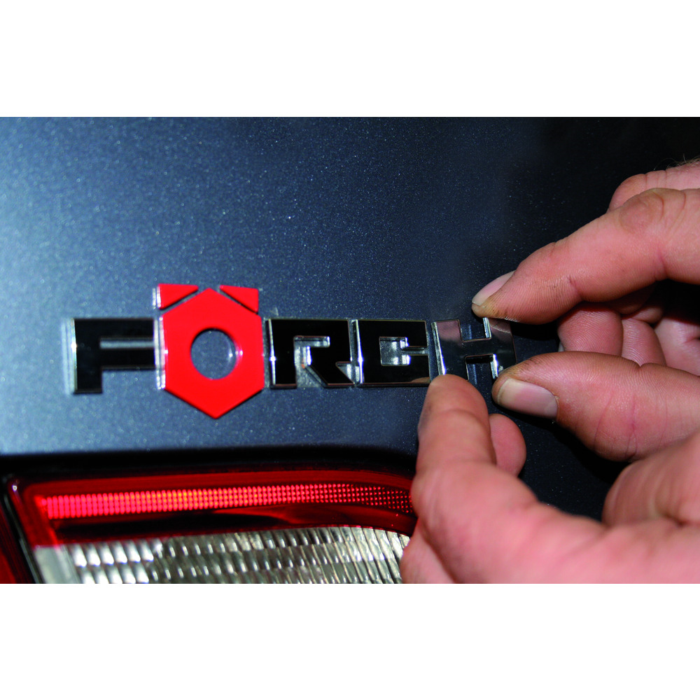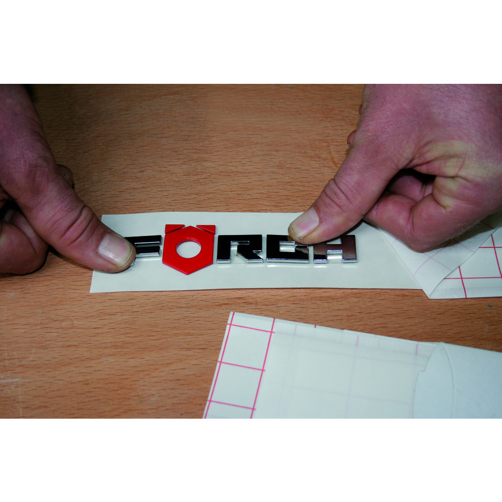 • potom odstráňte logo/reliéf z lepiacej plochy, umiestnite ho na príslušné miesto na vozidle a rovnomerne a pevne ho pritlačte