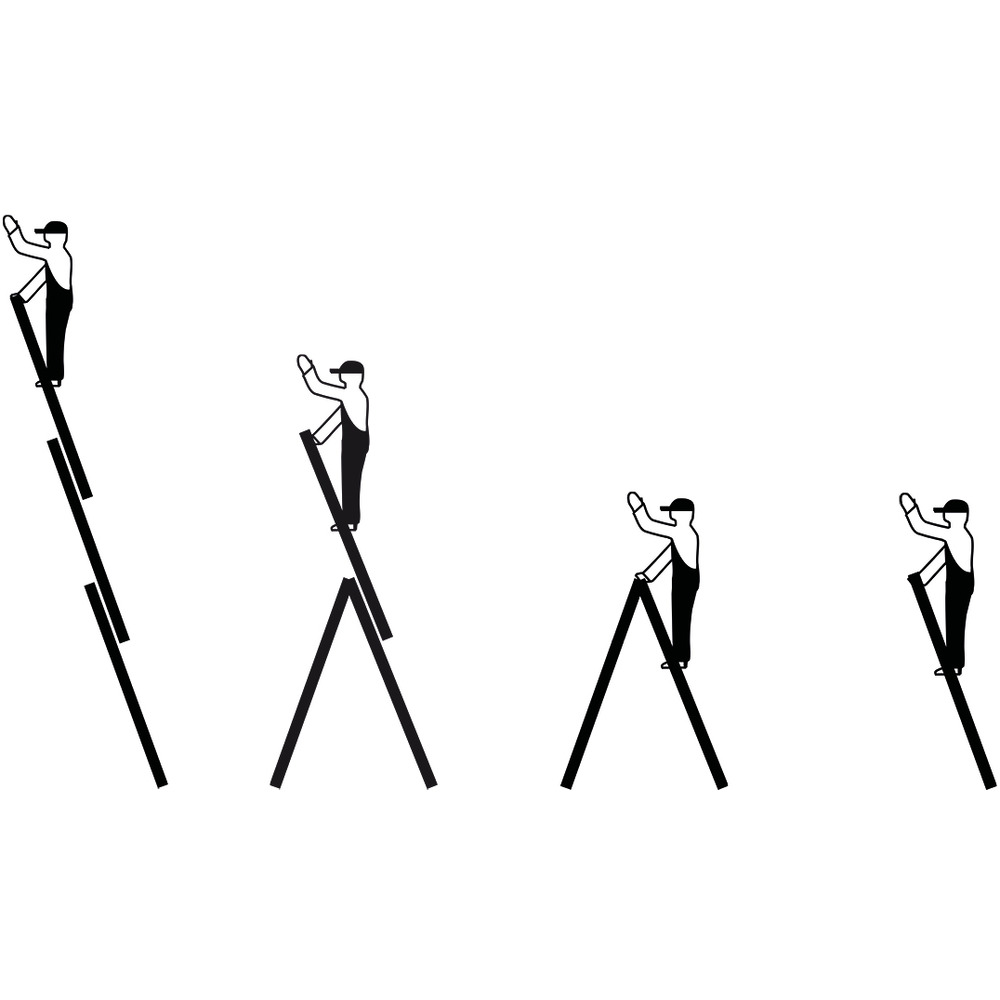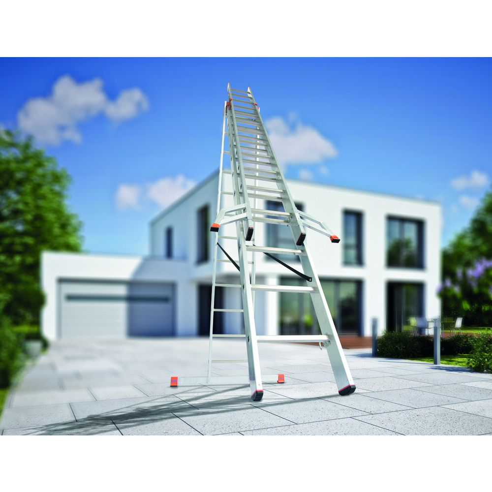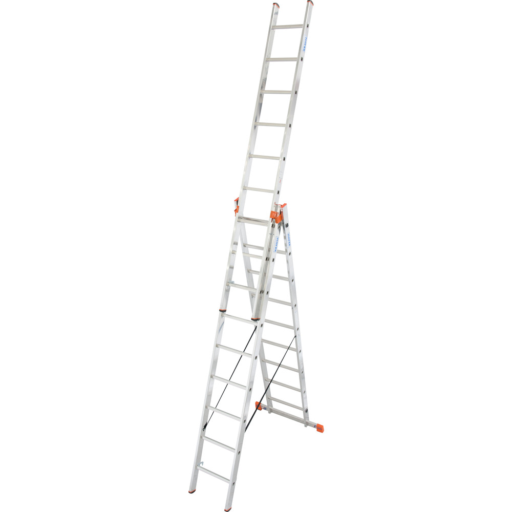 • třídílný víceúčelový hliníkový žebřík, který lze používat jako příložný, výsuvný i stojací žebřík